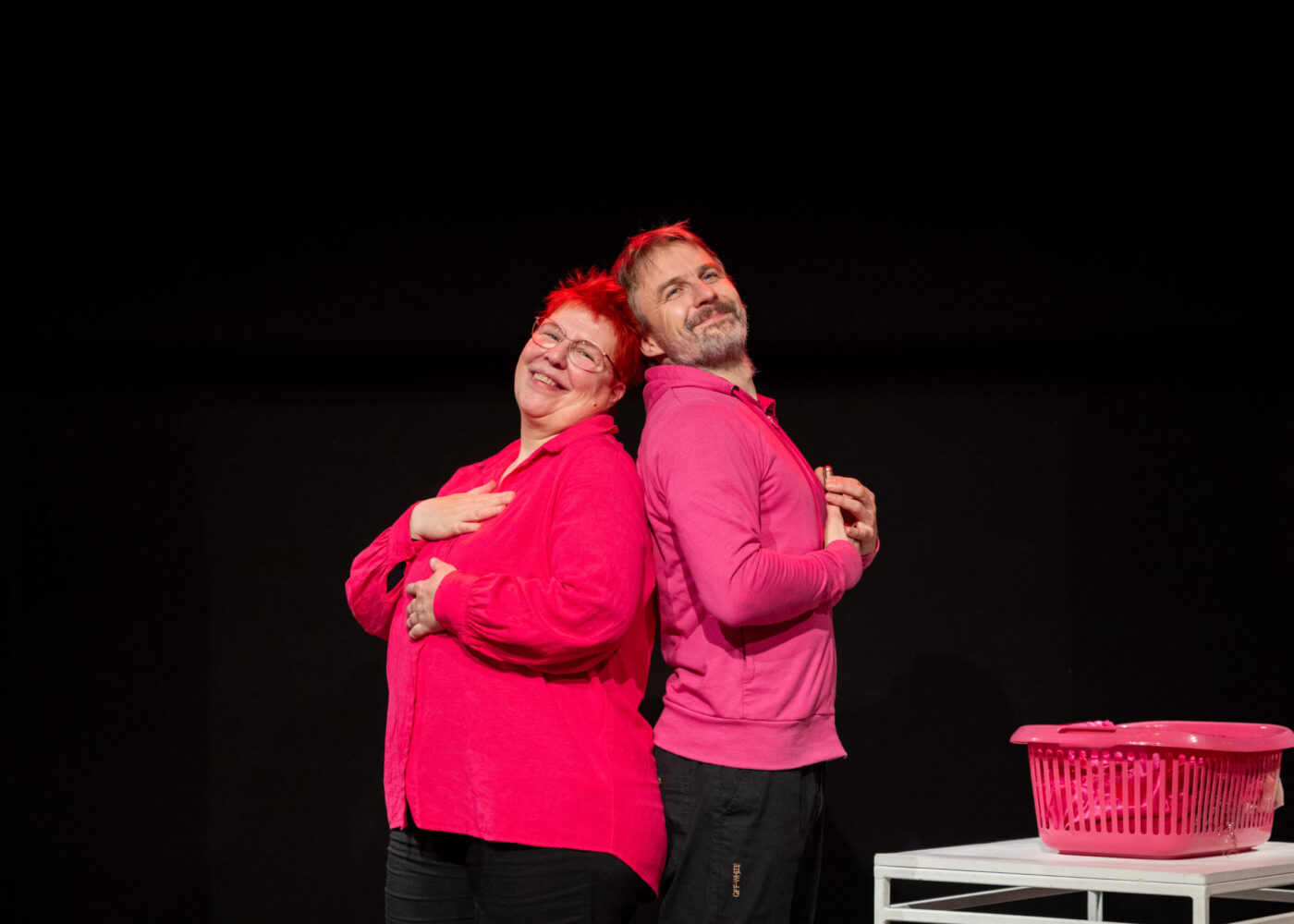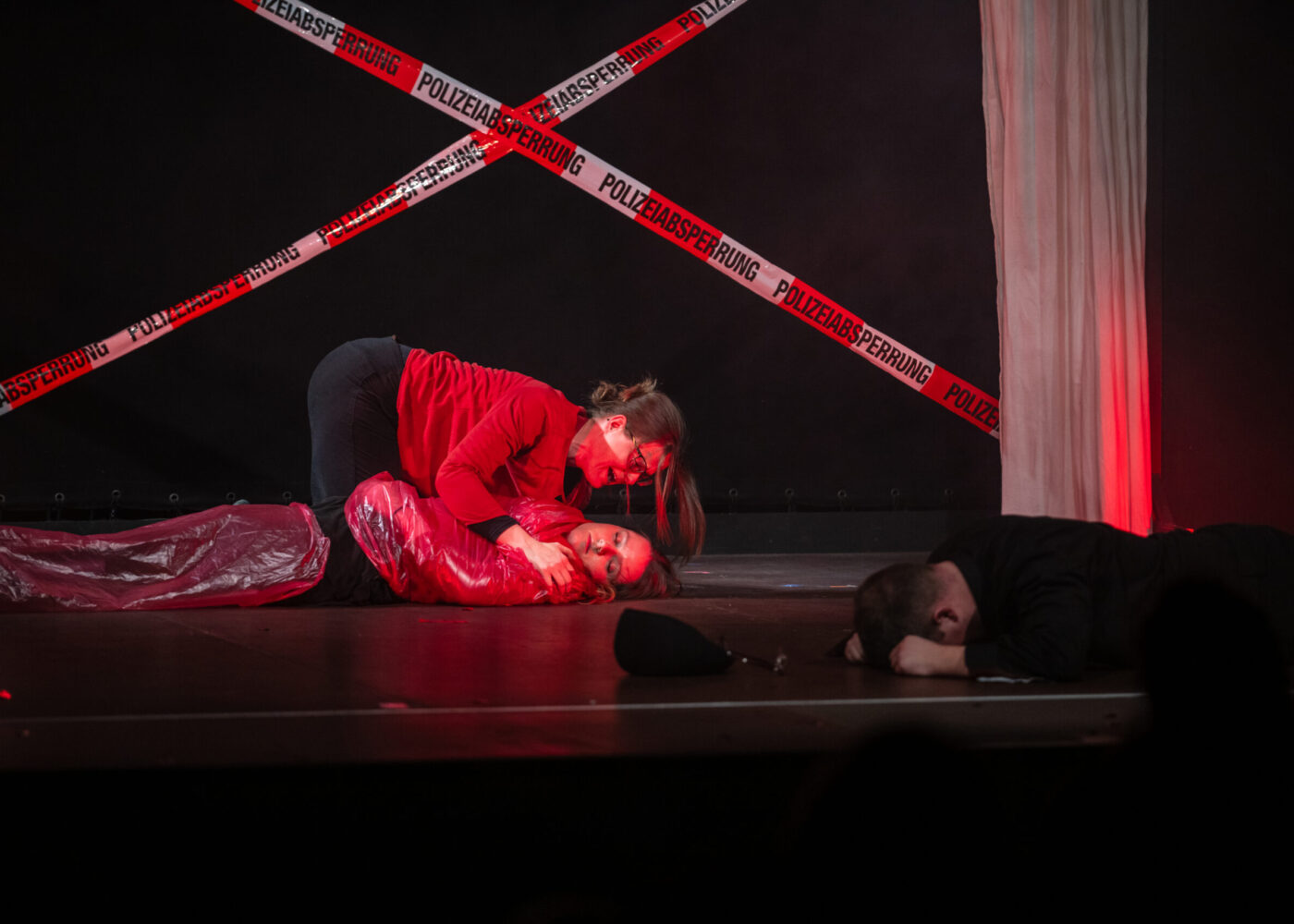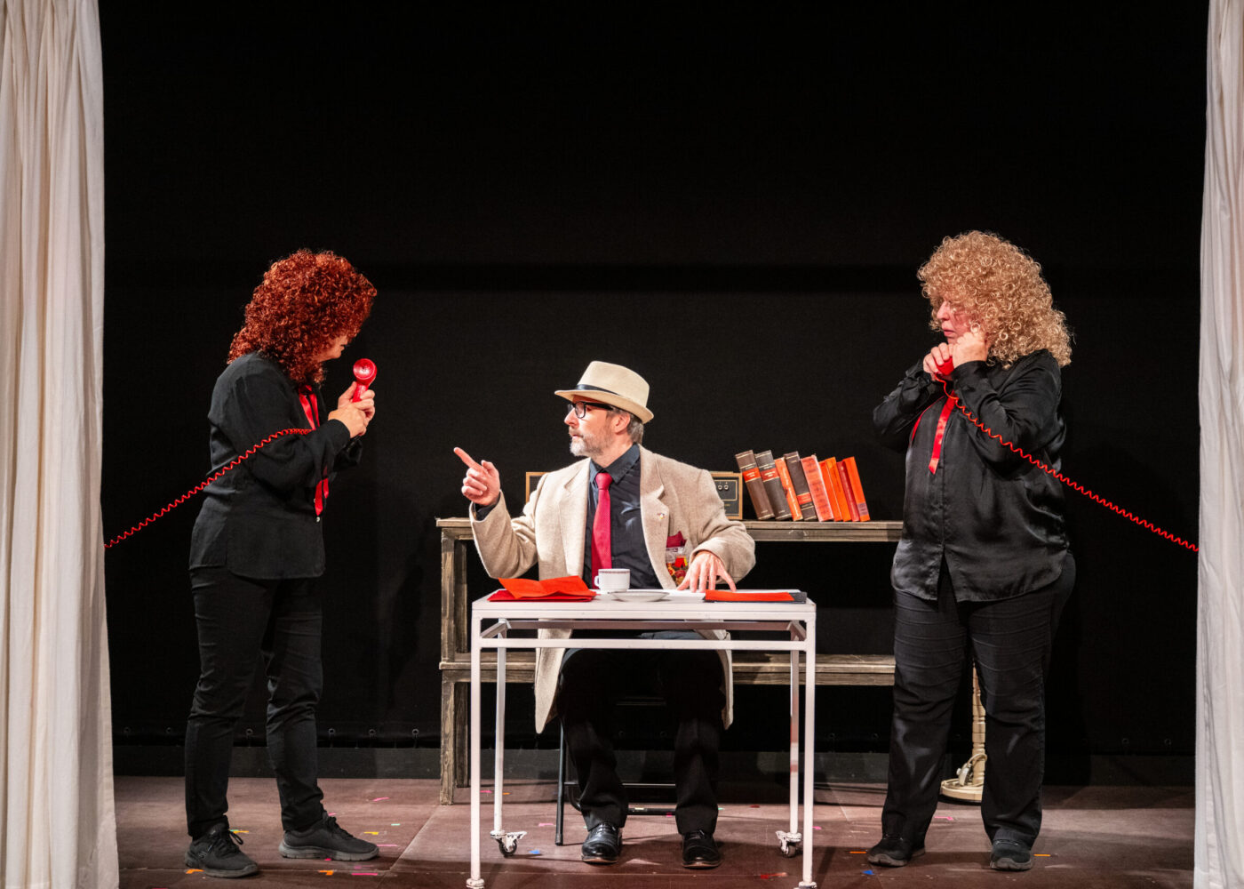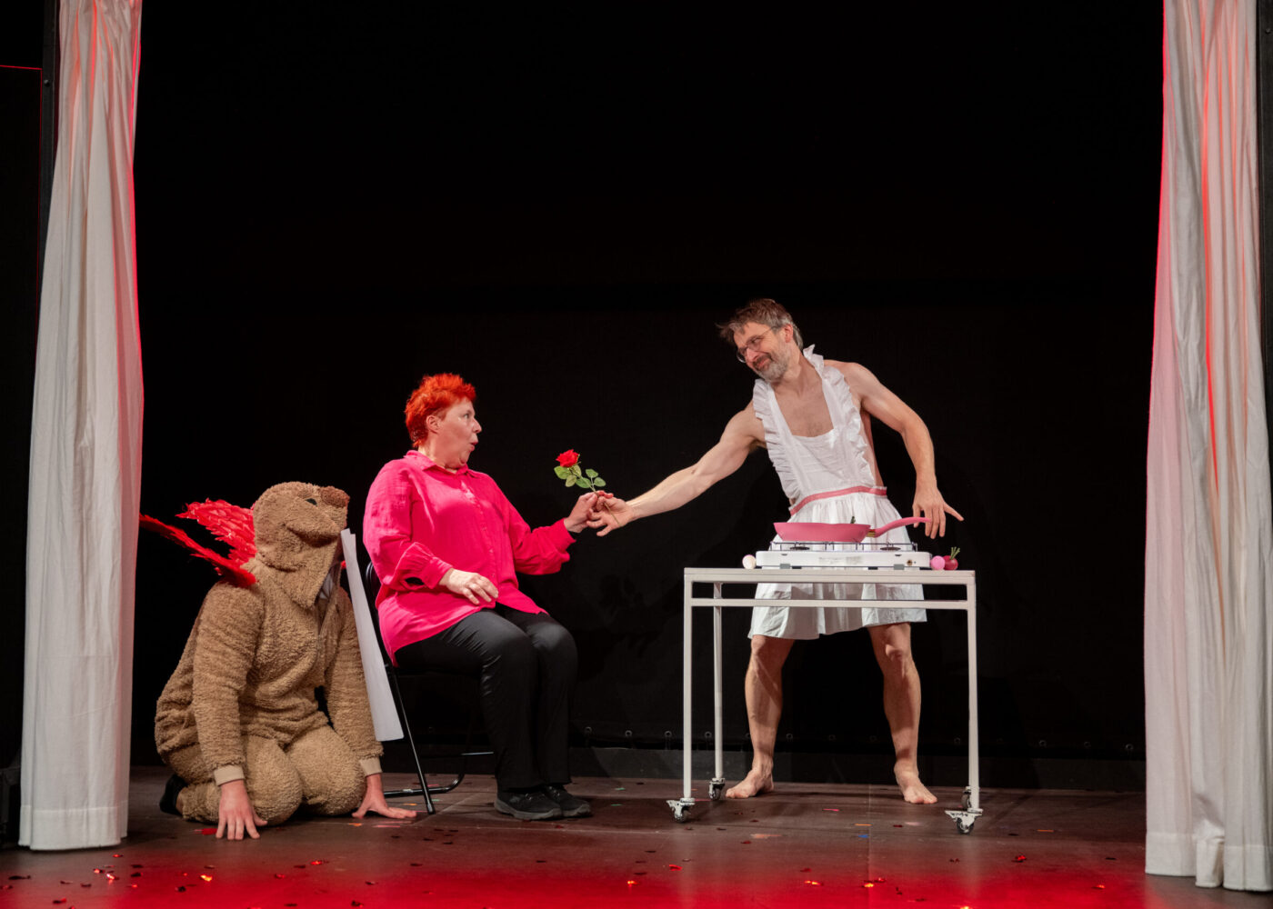 So bunt wie in der Liebe geht es auch auf der Bühne zu: Immer wenn von einer zur nächsten Story gesprungen wird, leuchten die Kostüme und die Dekoration in einem anderen prägnanten Farbton. Das gilt auch für den Vorhang, der schon mal zum Fahrstuhl, zur Plakatwand, zum Gefängnis, zum Königsmantel oder zur Spiegelfläche wird. Vor dem Vorhang spielt sich ein Drama der Jetztzeit ab, und wenn er sich öffnet, steht dahinter schon Personal aus dem 19. Jahrhundert bereit. Das minimalistische Prinzip rückt die Emotionen der Figuren in den Fokus – und davon gibt es pro Staffel so viele, dass unser Ensemble jeweils mehrere Rollen verkörpert.