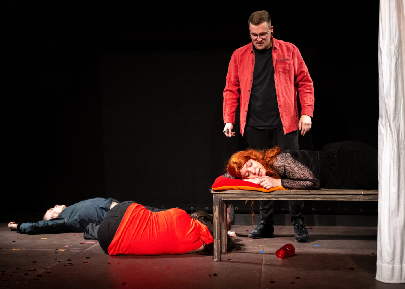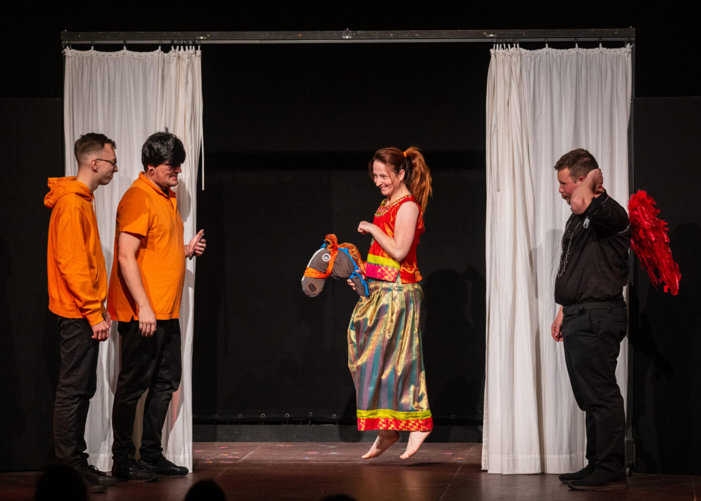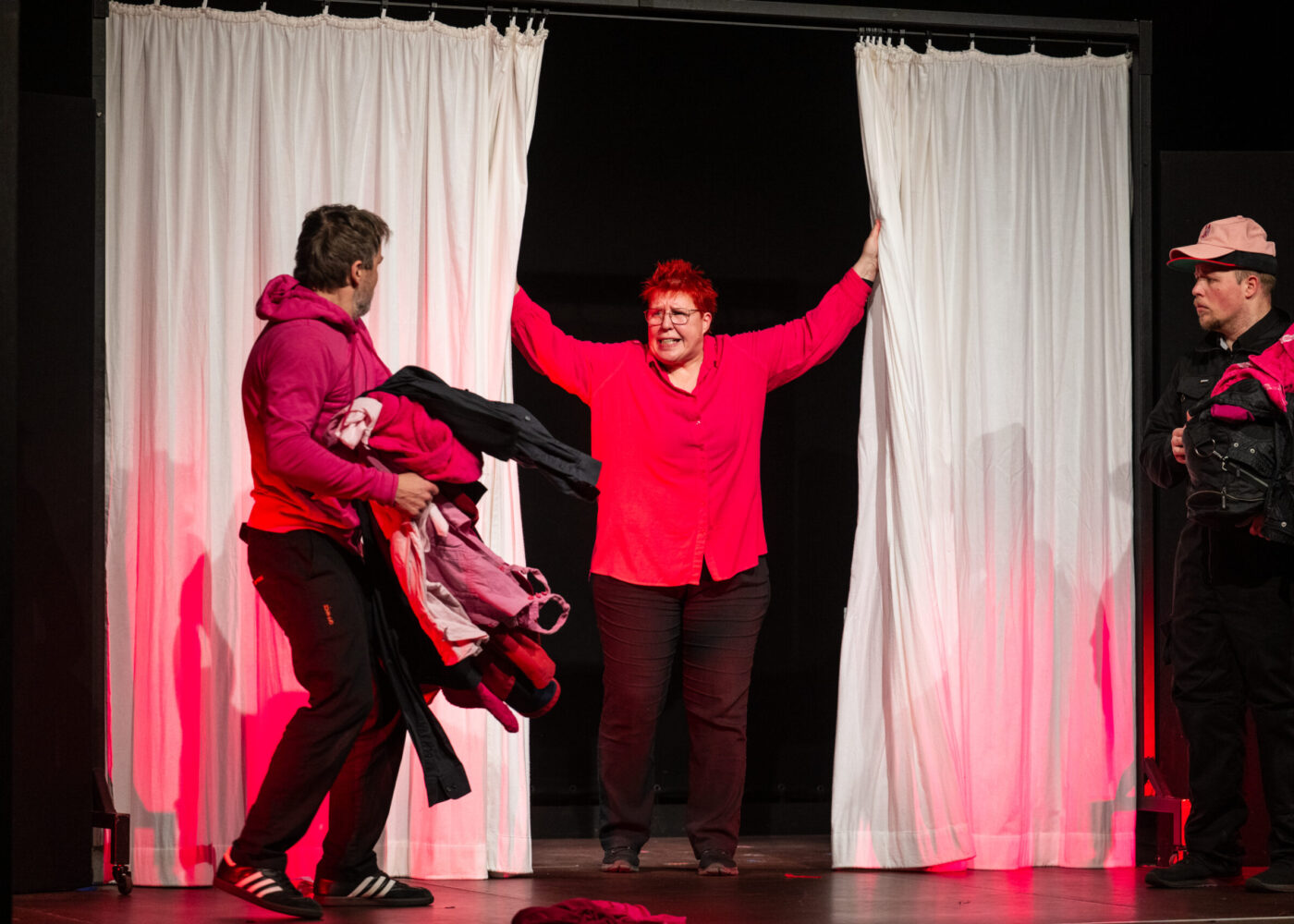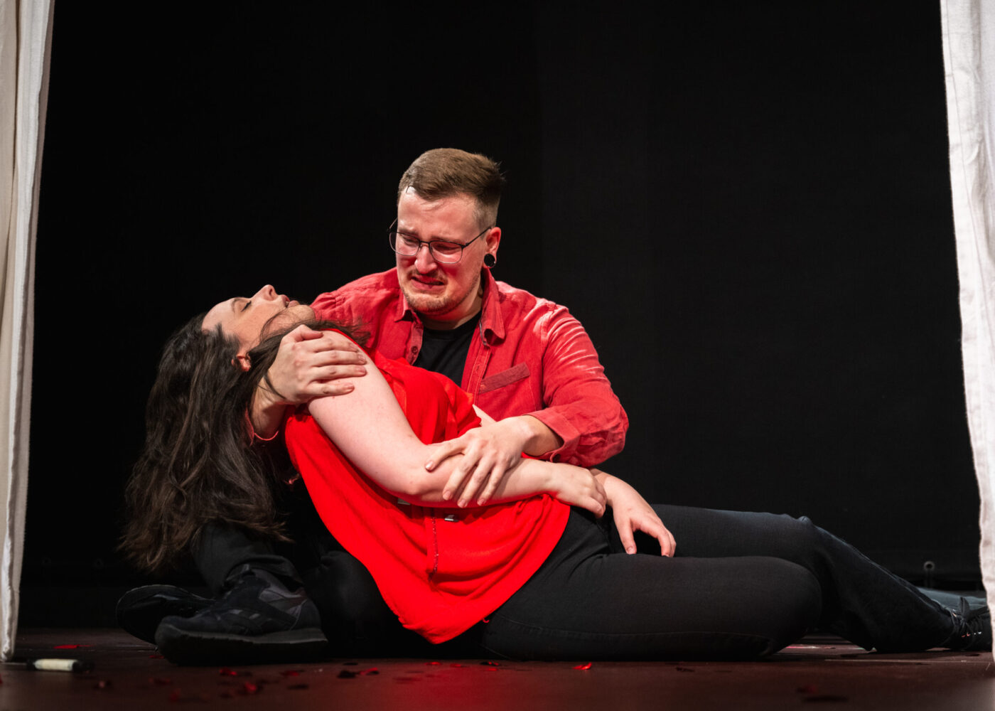 So bunt wie in der Liebe geht es auch auf der Bühne zu: Immer wenn von einer zur nächsten Story gesprungen wird, leuchten die Kostüme und die Dekoration in einem anderen prägnanten Farbton. Das gilt auch für den Vorhang, der schon mal zum Fahrstuhl, zur Plakatwand, zum Gefängnis, zum Königsmantel oder zur Spiegelfläche wird. Vor dem Vorhang spielt sich ein Drama der Jetztzeit ab, und wenn er sich öffnet, steht dahinter schon Personal aus dem 19. Jahrhundert bereit. Das minimalistische Prinzip rückt die Emotionen der Figuren in den Fokus – und davon gibt es pro Staffel so viele, dass unser Ensemble jeweils mehrere Rollen verkörpert.