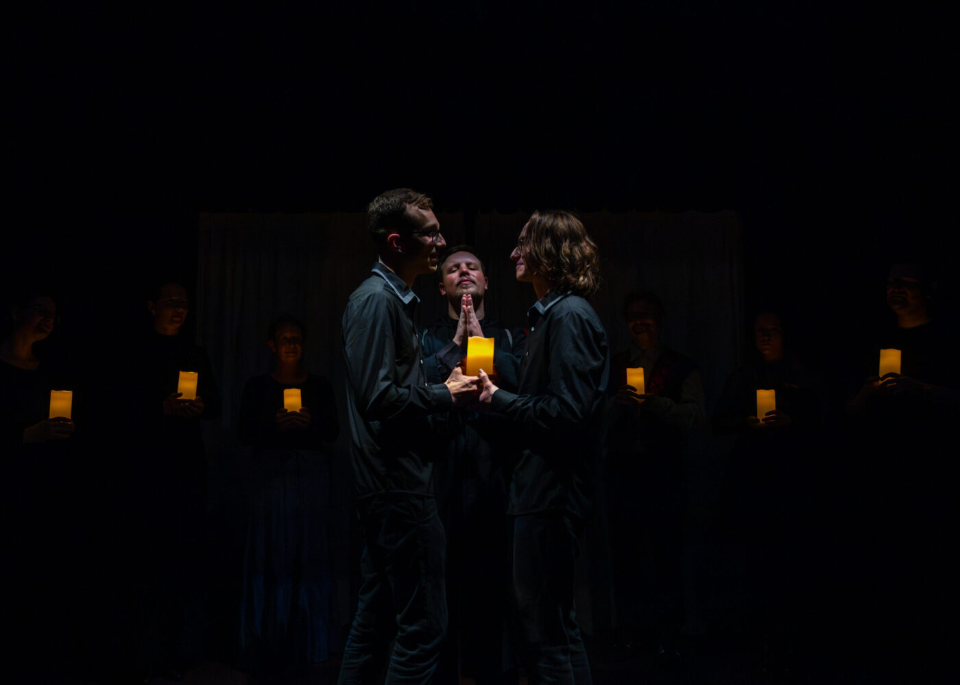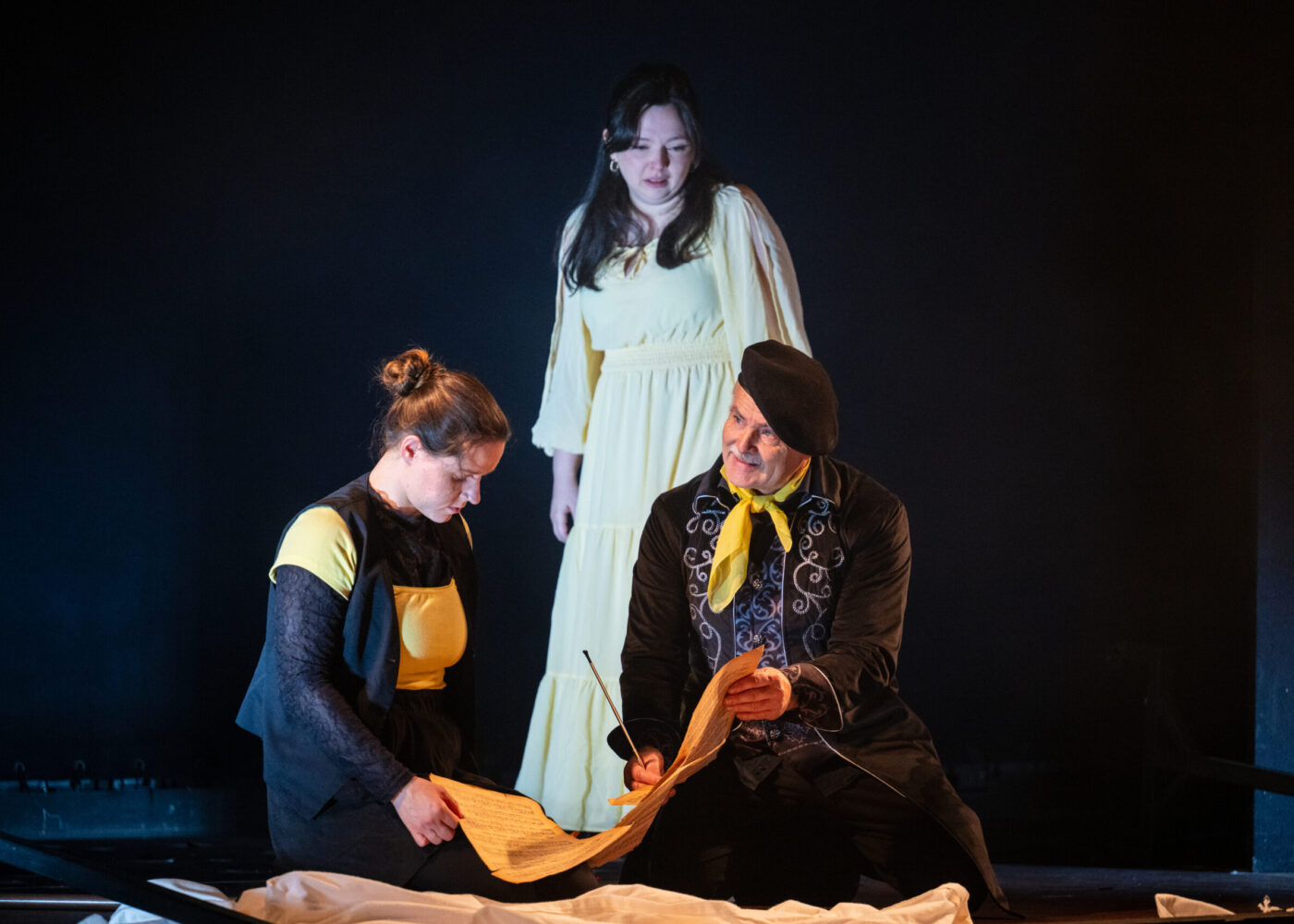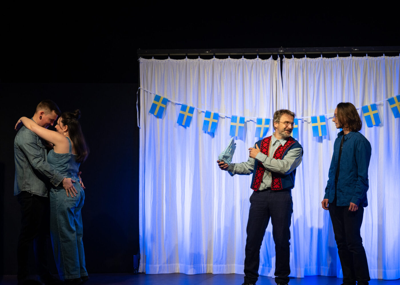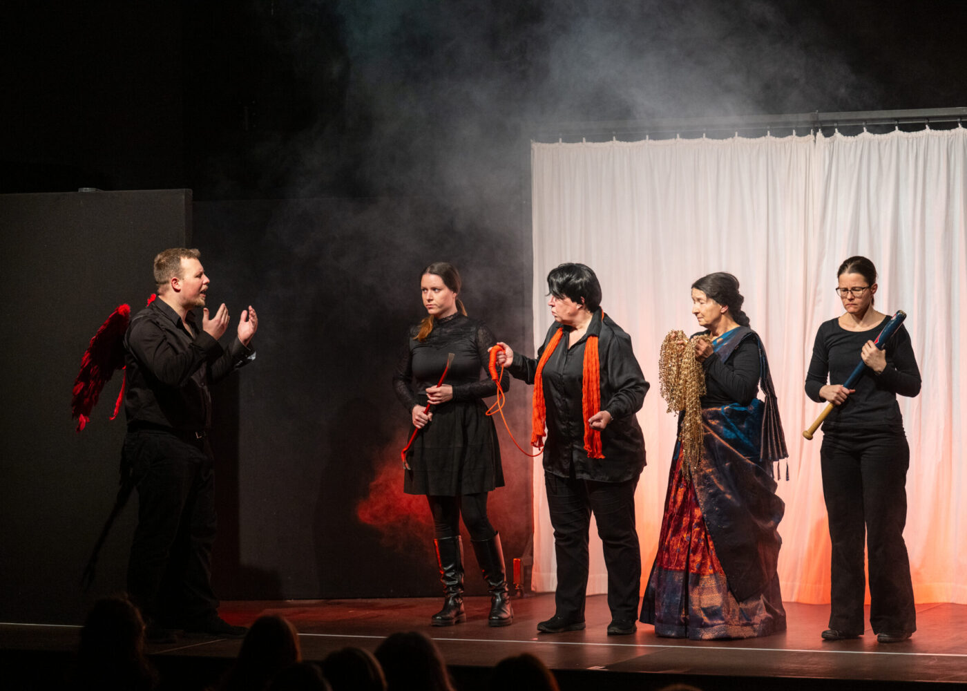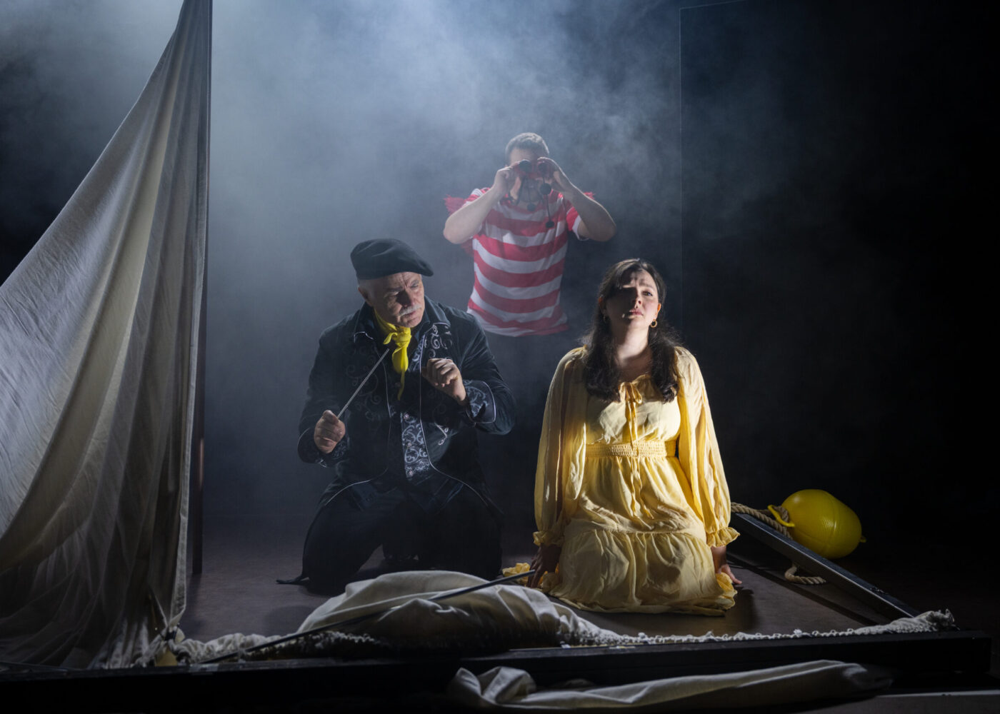 So bunt wie in der Liebe geht es auch auf der Bühne zu: Immer wenn von einer zur nächsten Story gesprungen wird, leuchten die Kostüme und die Dekoration in einem anderen prägnanten Farbton. Das gilt auch für den Vorhang, der schon mal zum Fahrstuhl, zur Plakatwand, zum Gefängnis, zum Königsmantel oder zur Spiegelfläche wird. Vor dem Vorhang spielt sich ein Drama der Jetztzeit ab, und wenn er sich öffnet, steht dahinter schon Personal aus dem 19. Jahrhundert bereit. Das minimalistische Prinzip rückt die Emotionen der Figuren in den Fokus – und davon gibt es pro Staffel so viele, dass unser Ensemble jeweils mehrere Rollen verkörpert.