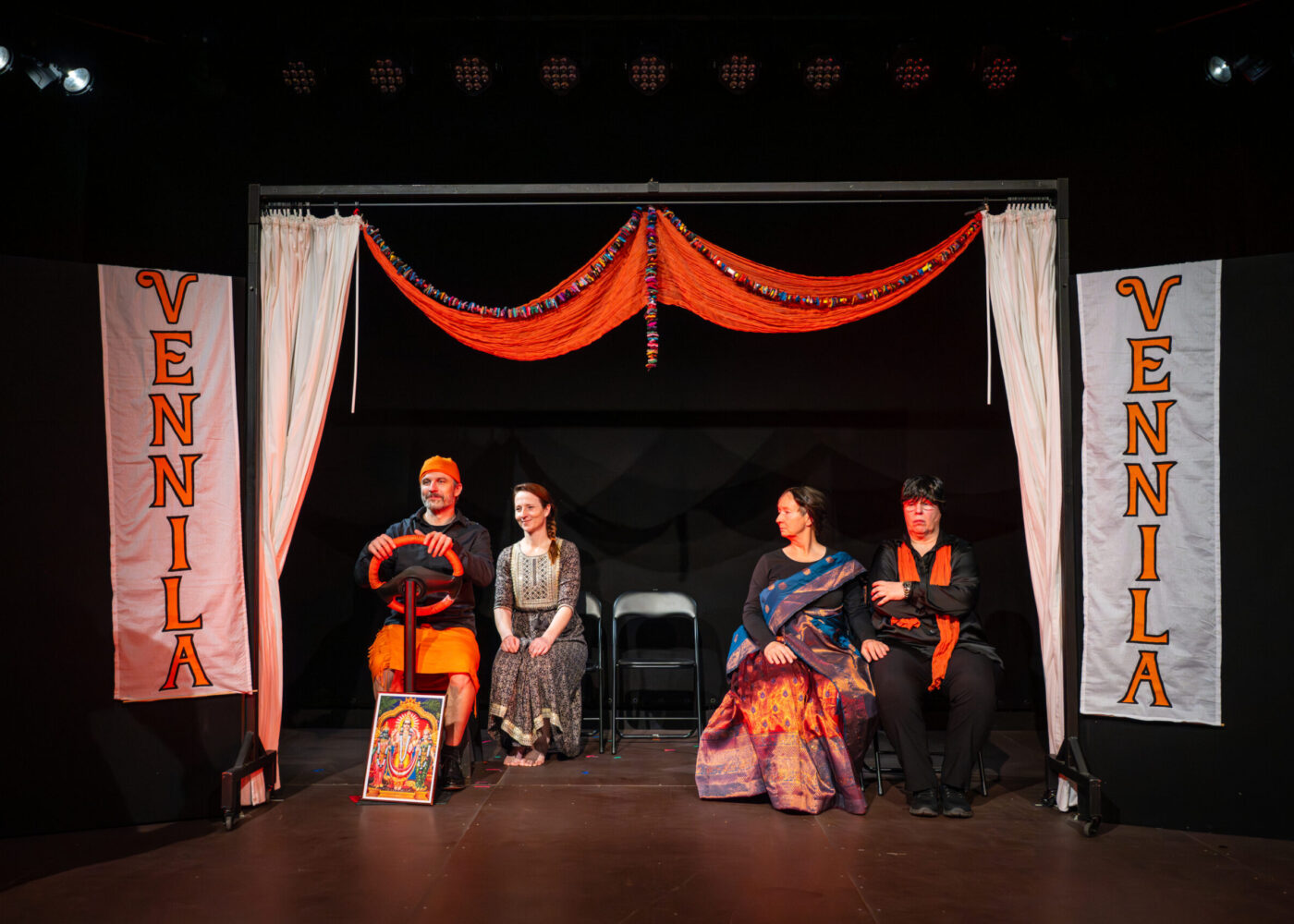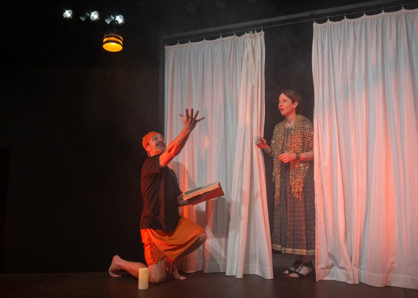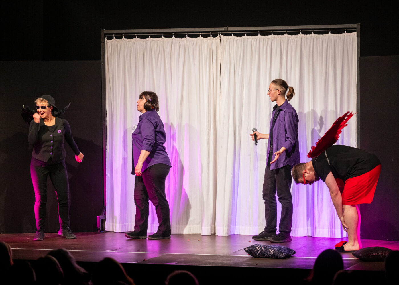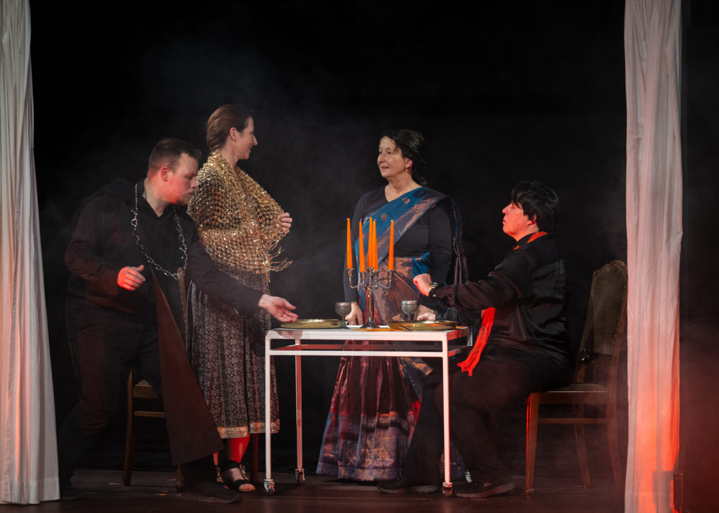 So bunt wie in der Liebe geht es auch auf der Bühne zu: Immer wenn von einer zur nächsten Story gesprungen wird, leuchten die Kostüme und die Dekoration in einem anderen prägnanten Farbton. Das gilt auch für den Vorhang, der schon mal zum Fahrstuhl, zur Plakatwand, zum Gefängnis, zum Königsmantel oder zur Spiegelfläche wird. Vor dem Vorhang spielt sich ein Drama der Jetztzeit ab, und wenn er sich öffnet, steht dahinter schon Personal aus dem 19. Jahrhundert bereit. Das minimalistische Prinzip rückt die Emotionen der Figuren in den Fokus – und davon gibt es pro Staffel so viele, dass unser Ensemble jeweils mehrere Rollen verkörpert.