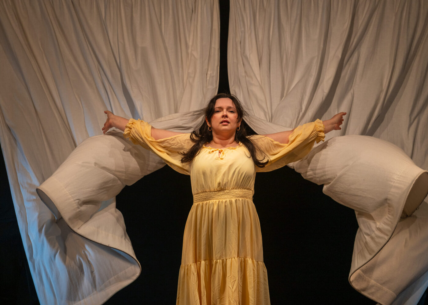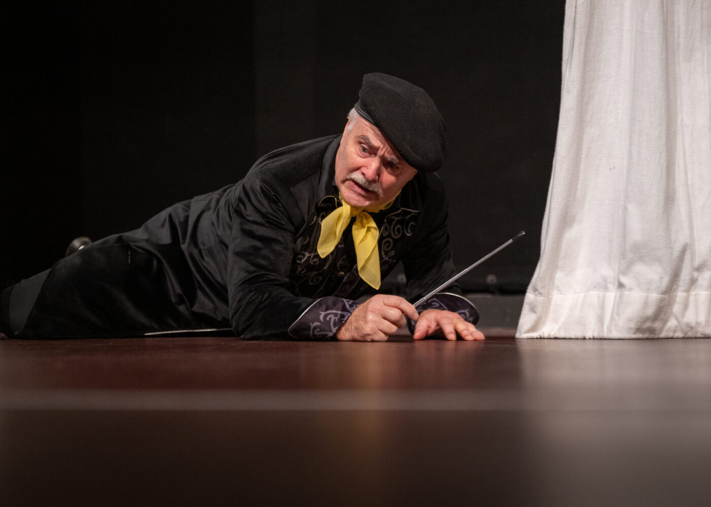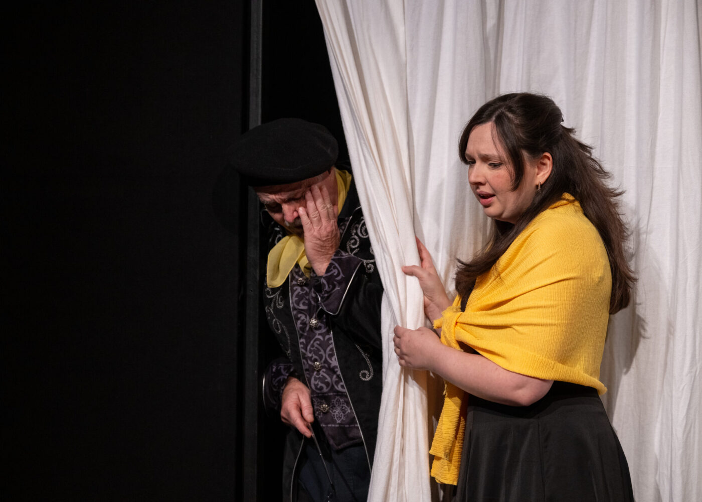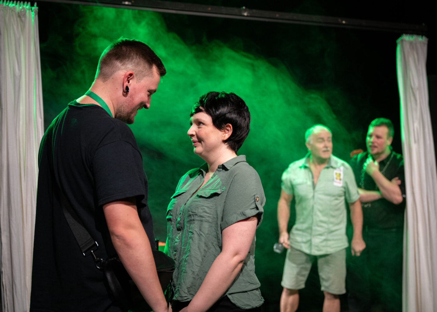 So bunt wie in der Liebe geht es auch auf der Bühne zu: Immer wenn von einer zur nächsten Story gesprungen wird, leuchten die Kostüme und die Dekoration in einem anderen prägnanten Farbton. Das gilt auch für den Vorhang, der schon mal zum Fahrstuhl, zur Plakatwand, zum Gefängnis, zum Königsmantel oder zur Spiegelfläche wird. Vor dem Vorhang spielt sich ein Drama der Jetztzeit ab, und wenn er sich öffnet, steht dahinter schon Personal aus dem 19. Jahrhundert bereit. Das minimalistische Prinzip rückt die Emotionen der Figuren in den Fokus – und davon gibt es pro Staffel so viele, dass unser Ensemble jeweils mehrere Rollen verkörpert.