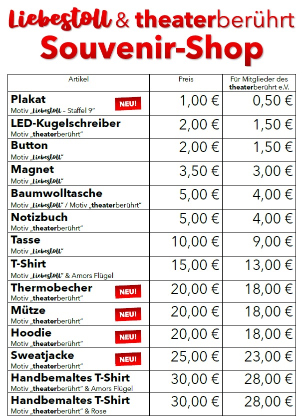 Sie suchen ein Andenken mit unserem „Liebestoll“-Logo oder dem „theaterberührt“-Schriftzug?